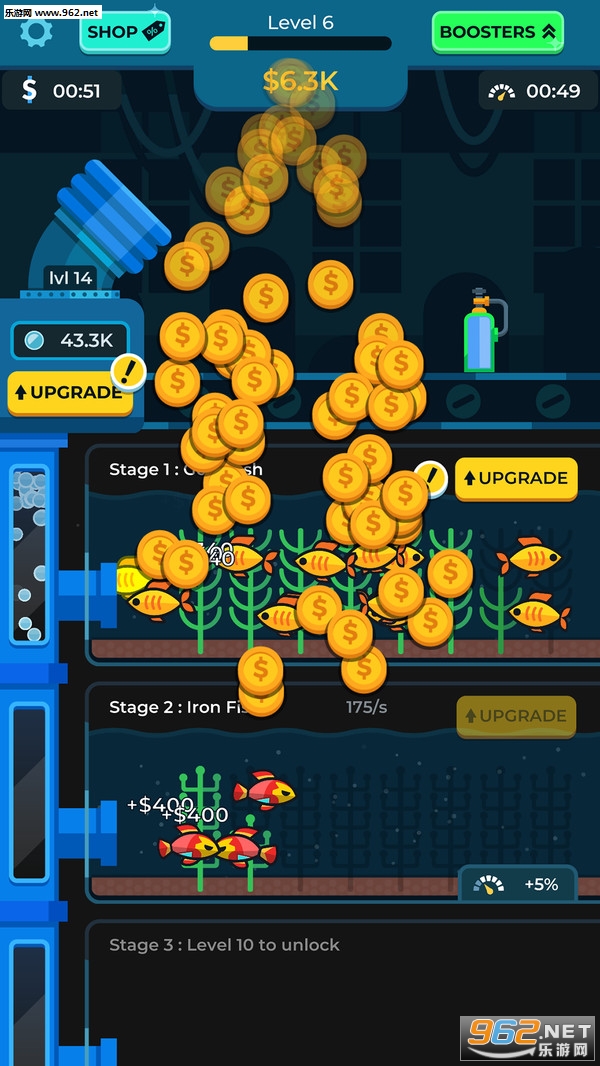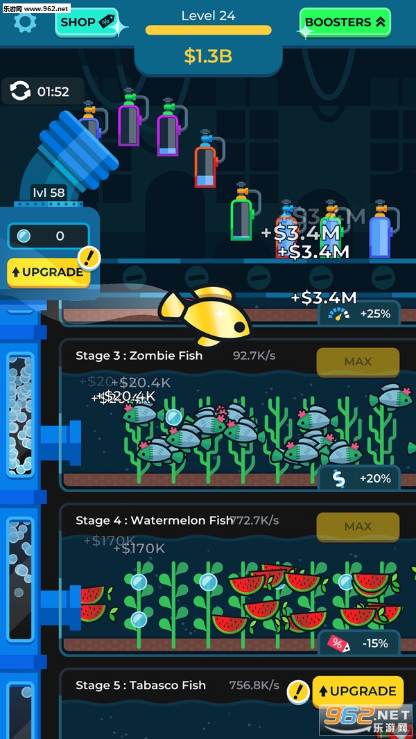 2、可以通过这种方式赚取并投资更好的设备、全新种类的鱼和藻类,加快进度并赚取更多金币;