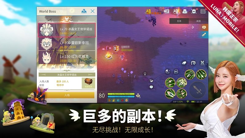 以人气PC线上MMORPG「Luna Online」IP开发的一款开放世界手游。游戏之中我们将要化身为勇者在全新的幻想世界探险,你会经历不同的剧情故事,接受各种挑战,击败邪恶的敌人,采用童话风全3D美术,可爱的角色、装扮、广阔地世界地图与迷宫、数百种挑战任务、坐骑、宠物、游戏内结婚系统等均将于本作实装,经典的Luna IP,并且是Luna Online的移植版!