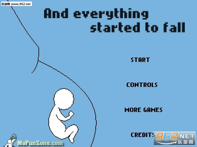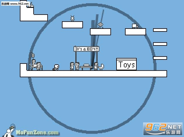 首先这个游戏的开始节目是一个胎儿画面,玩家在进入游戏之后,开始是一个胎儿,然后是一个小孩,随着游戏的发展,你的角色要一步步的向上跳,你的角色也会一步步的长大,变成学生、少年、年轻人、中年人,最后变成一个老人,而游戏的结局就是死去。将一个人的一生的经历的短短几分钟就描绘了出来。
