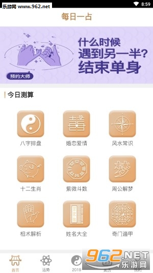 包含八字详批、大师问答、姻缘预测、八字合婚、十年大运、事业详批、大师解签、大师解梦等功能。