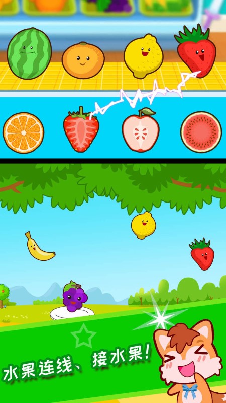 通过与宝贝的互动游戏,其中互动包括连线、打开礼物盒单种水果的介绍、移送盘子中一半的水果接住对应的另一半水果;