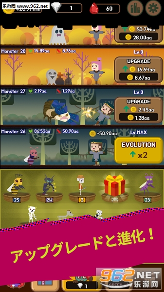 一款轻松有趣的休闲放置游戏,游戏中玩家将获得各种各样的怪物来进行合成进化,挑战丰富的场景和关卡,游戏的玩法丰富有趣,还有着各种各样的种类怪物供你选择,打败所有的敌人,收集90多种不同的怪物,推荐给喜欢休闲游戏的玩家。