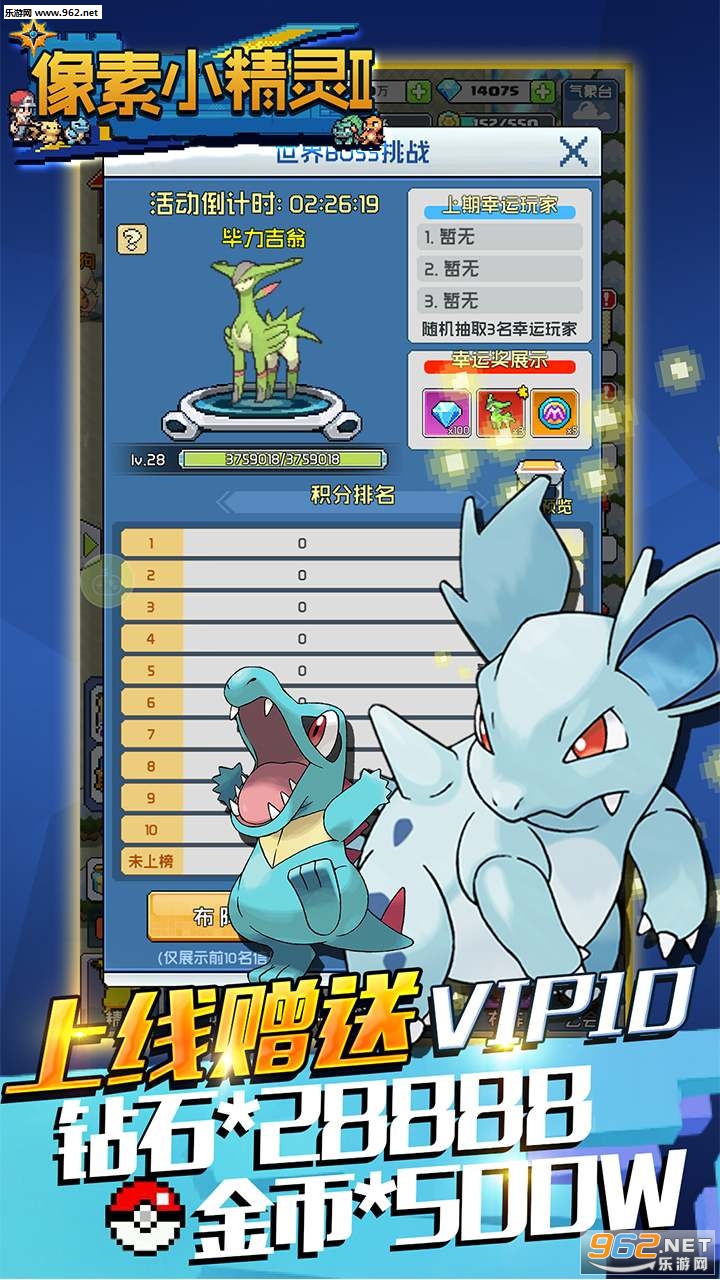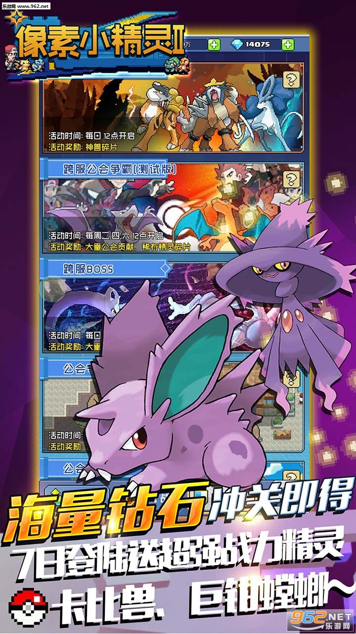 4.海量钻石冲关即得,7日登陆送超强战力精灵:卡比兽、巨钳螳螂