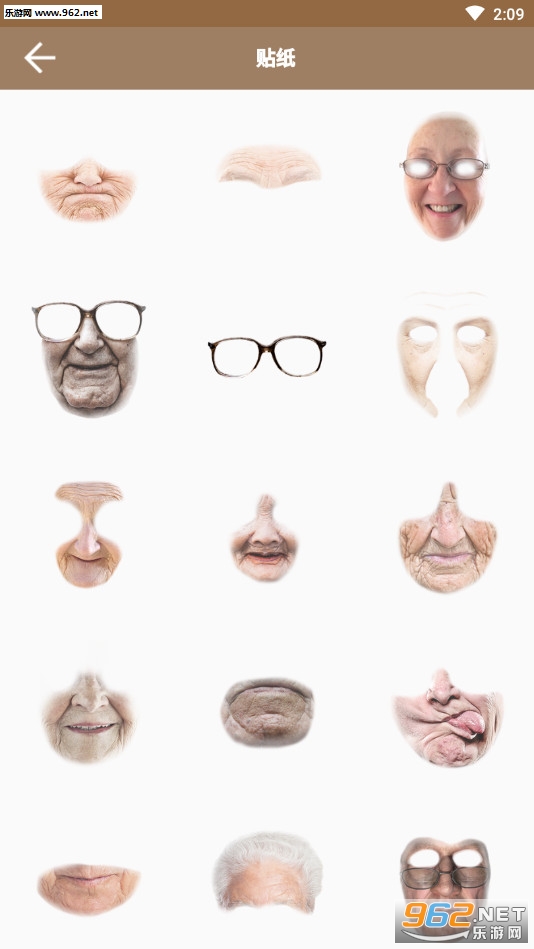 4.添加老化的面部贴纸,如眼镜或单片眼镜,有趣的小胡子和胡须,眉毛,白发,皱纹的皮肤!
