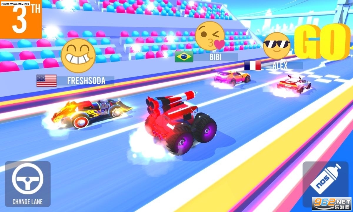 在炫酷赛道上,与来自世界各地的玩家比拼,每场比赛多达 3 位对手