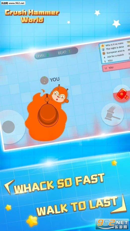 破碎锤世界(Crush Hammer World)游戏是一款非常考验玩家手速的打地鼠游戏,和一般的打地鼠游戏不同,这款游戏加入了更多的创意性元素,玩法做了全面的升级,在游戏中玩家需要拿起手中巨大的锤子击打敌人,将突然从地下冒出来的光头强锤进去,完成目标任务要求即可闯关成功。