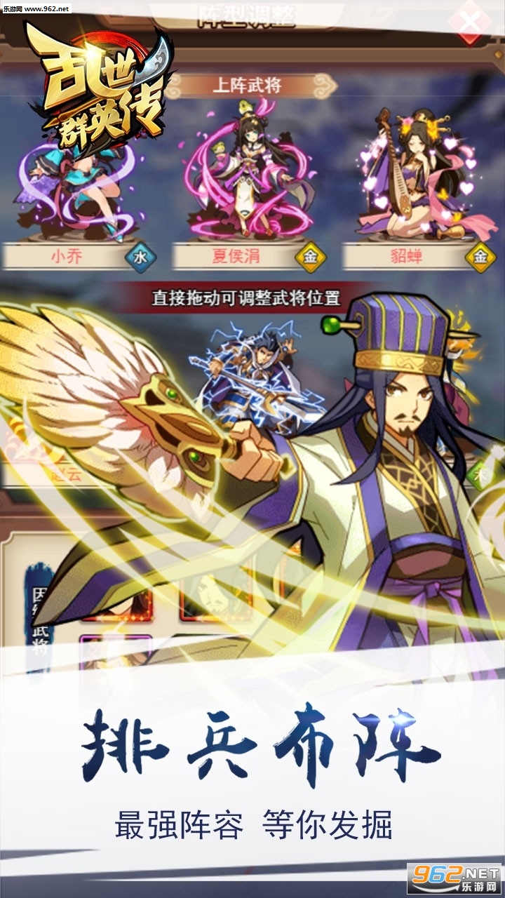 《乱世群英传》是一款以三国武将为题材的回合制游戏。游戏以Q版武将形象和简单的操作为大家再次描绘一个不一样的三国。各位玩家在游戏中可以使用各个著名的三国人物,来组建自己的队伍,玩法上不仅有精心设计的地图关卡,过关斩将的经典战役,更有丰富的PVP玩法和实时的玩家对战,演绎各自心中最喜欢的三国战场。武将更可以通过升级、培养、超进阶等方法,自由打造最强武将,随心搭配阵容。各种组合千变万化,让你亲身领略三国中的刀光剑影、鼓角铮鸣。