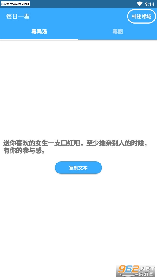 《每日一毒app》是一款为朋友们打造的毒鸡汤和毒图软件,点击屏幕可以不断的获得各种各样的毒鸡汤文字或者美女图片,比如送你喜欢的女生一只口红吧至少她亲别人的时候有你的参与感,图片有二次元美少女也有真实美女的写真。
