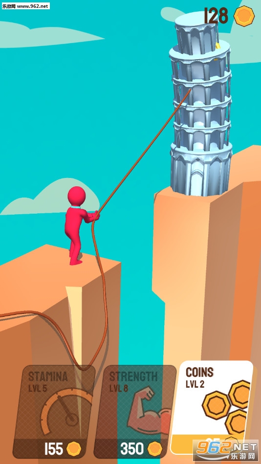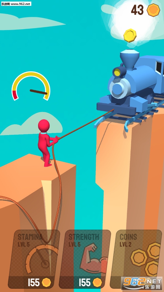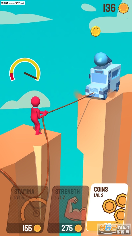 趣味的拔河游戏,玩家可以赚取金币不断的强化角色的力量,将火车、汽车、大楼等全部拉下悬崖,可以通过点击屏幕来加大力度,点击的速度越快力度越大。
