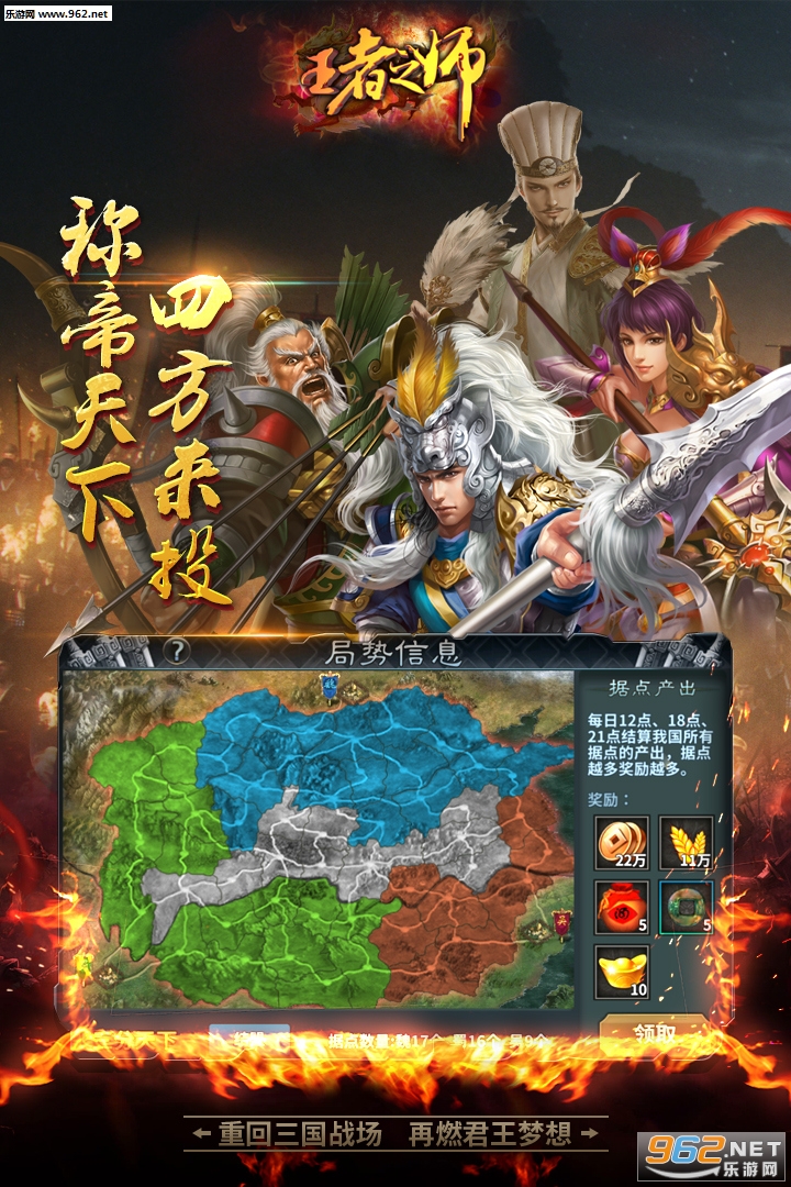 《王者之师》是一款三国类策略手游,玩家可在游戏中获得自己的领地,并对领地进行建设,同时玩家还可以进行领地结盟、争夺地区霸主以及争夺国王,游戏内武将众多,各有特色,提供了极强的武将组合策略空间。