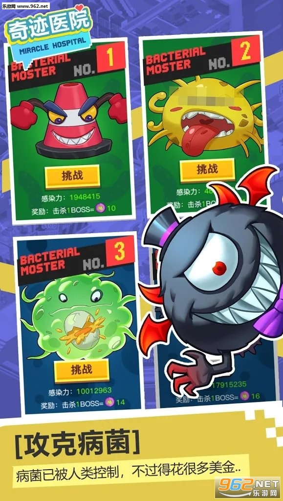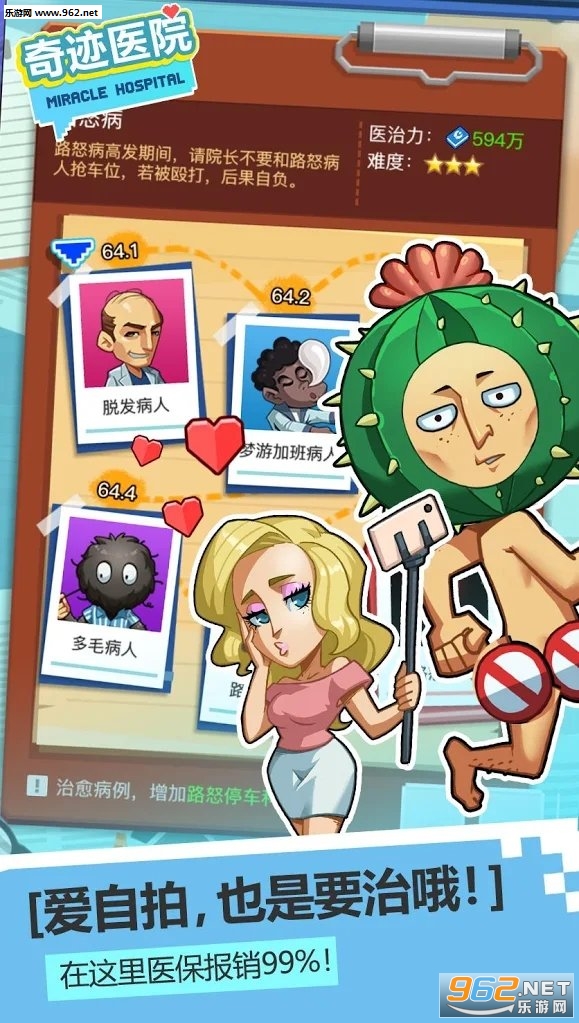 《奇迹医院》是一款卡通风格的医院题材模拟经营游戏,游戏中充满了各种各样的搞笑元素,游戏的操作简单容易上手,还有着丰富有趣的玩法等待你的挖掘。各种各样奇怪的病症,和各种各样奇怪的治疗方式,让你笑的停不下来,赶快下载体验吧!