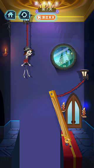 5、这一关,考验的是我们的速度,只要在安全地带割断绳子,火柴人就可以成功出逃。