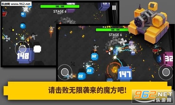 一款独特的街机射击类游戏,游戏画面看起来非常简单,但是玩法十分有趣。操作也很方便,玩家需要驾驶坦克消灭从四周袭来的魔方,击杀的魔方越多得到的奖励越多,战力品可用来升级自己的坦克,让坦克威力更加强大。