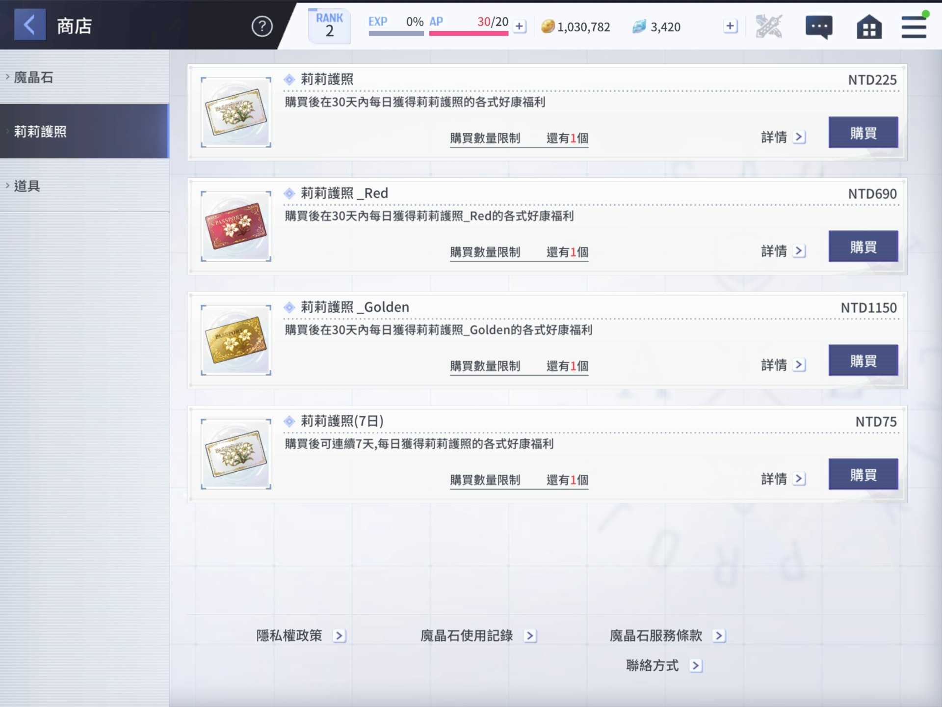 本作回忆卡强度高度依赖满突”(满破),未满突卡牌在后期可能难以使用。因此,若计划长期游玩,适度课金积累资源将显著提升体验。推荐优先考虑莉莉护照”(月卡),普通版(225台币)性价比最高,提供活动掉落×2、每日Skip券及体力回复道具等实用福利。