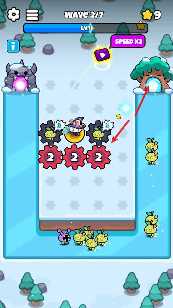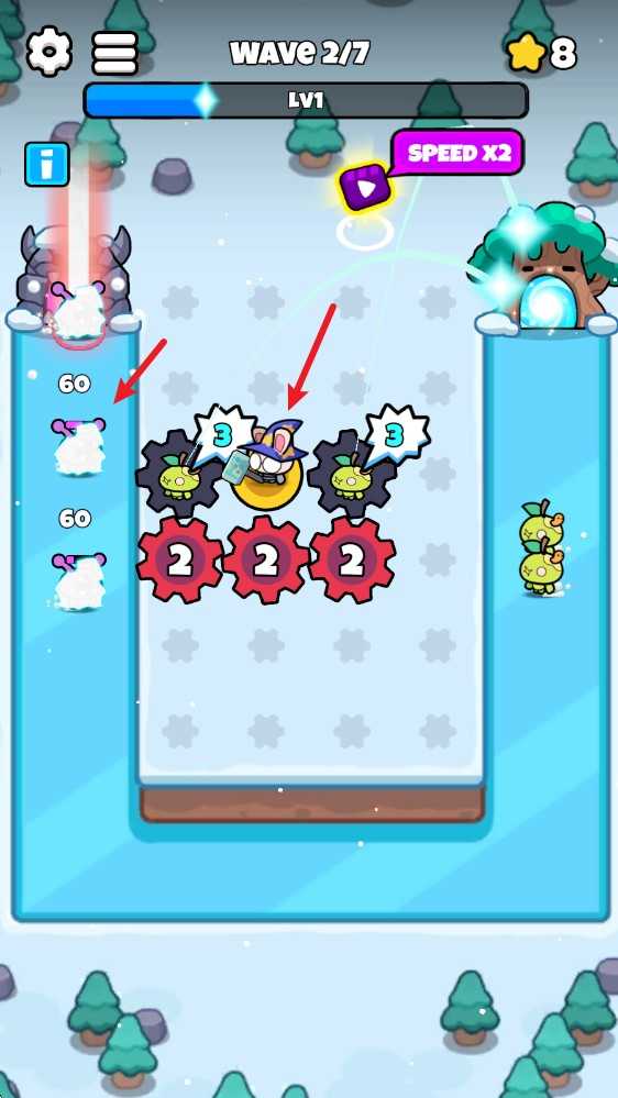 战斗过程中,屏幕右上角的齿轮持续旋转,自动产出作战单位;右下角则实时显示剩余敌人数目。你需要根据战场态势灵活调整阵型,及时合成相同齿轮以提升效能,并在每波战斗间隙快速修整,为下一波攻势做好准备。