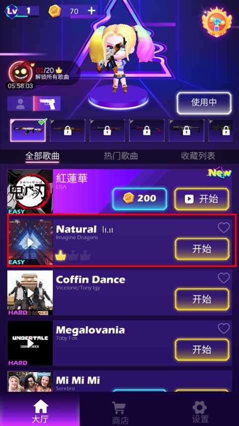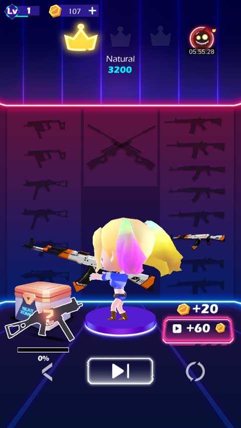 除了闯关获得奖励,游戏还设有专属点击阶段”:在结算界面点击屏幕中央按钮,进入限时疯狂点击模式。通过高频点击可快速积累金币,用于后续购买强力装备或炫酷皮肤,助力你更轻松应对高难度曲目。