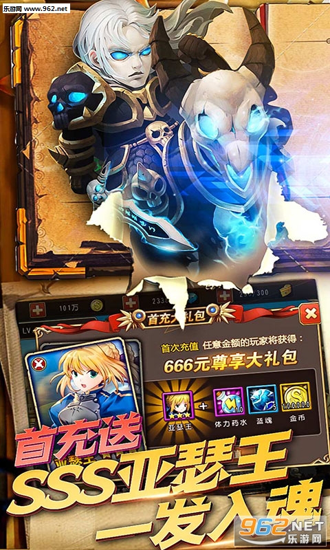 3、超值福利来了!首充任意金额送666元尊享大礼包,三星【亚瑟王】豪华助阵,加送10000钻石、高级材料、体力药水。