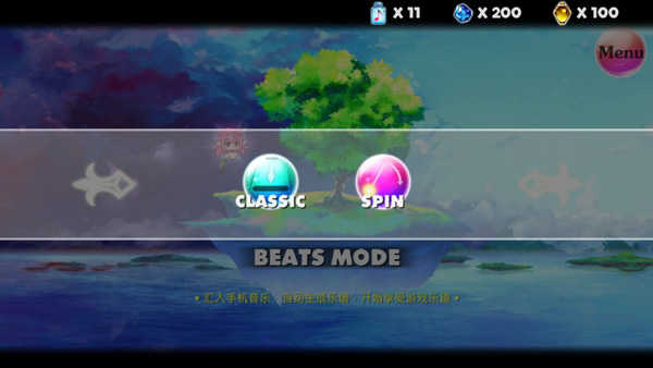 在这个模式下,不论歌曲难度,只允许单击音符存在,雪花会没有规律没有固定轨迹的飘落(玩过兰空的小伙伴可以很快理解),在背景时不时会出现无意义的雪花对玩家进行干扰,这个模式对瞬时反应力的要求非常大(当然你可以把落速调慢一点)。随之而来的是魔法光球模式。