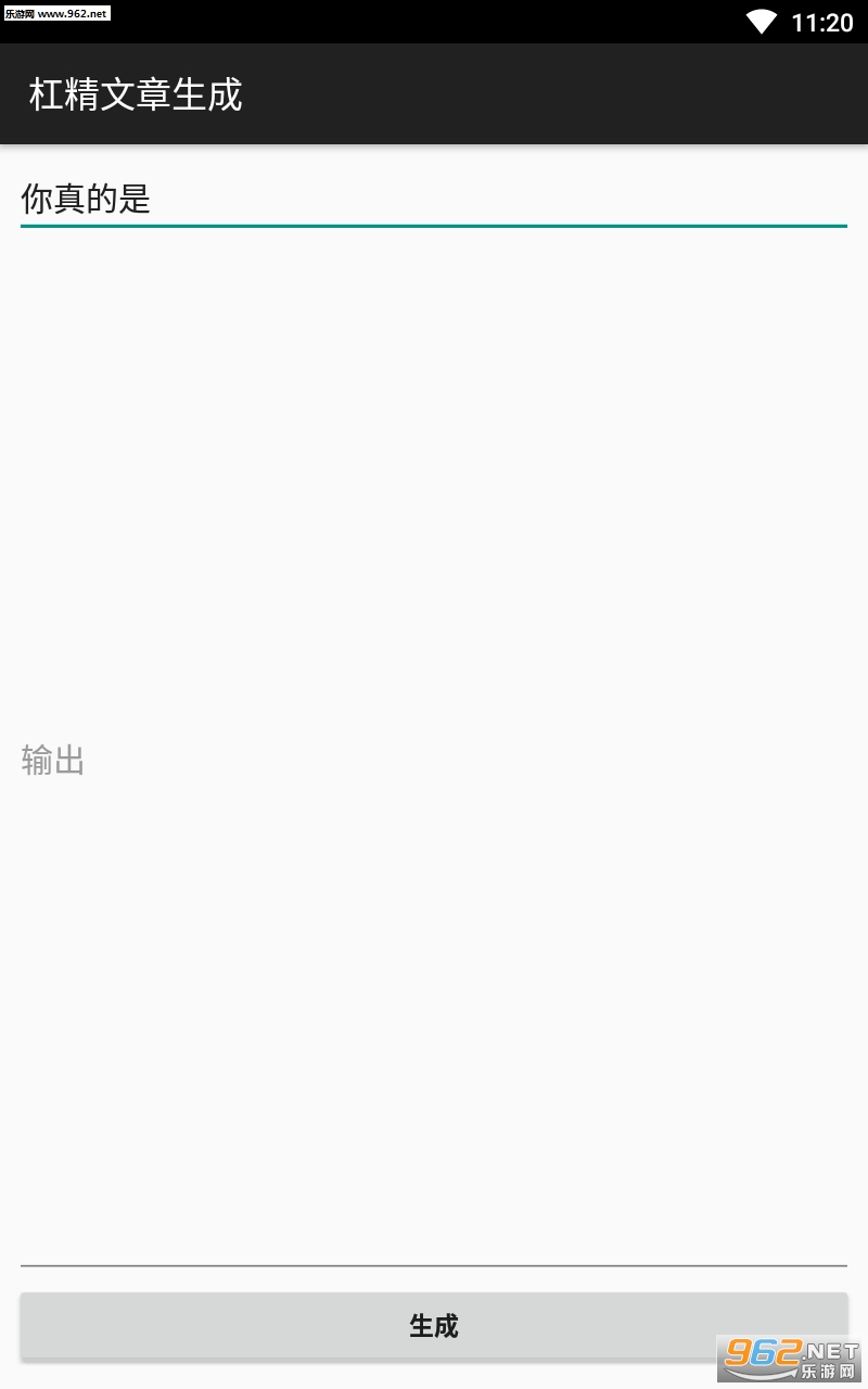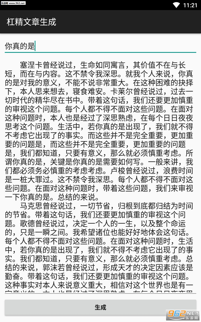 总体来说是一款非常有趣的文章生成器软件,和之前的狗屁不通的文章生成器一样,这款软件也是需要用户们输入一个简单的文字就可以随机的生成一大段文字,这些文字更加的有趣,都是杠精的经典语录,喜欢的亲们赶紧下载吧。
