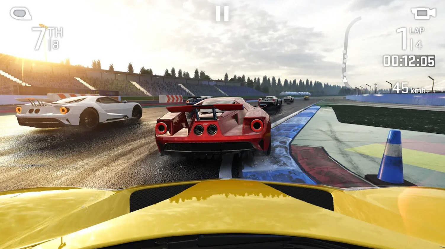 游戏提供两种核心操控方式——重力感应与屏幕触控,并细分为7种个性化操作配置,满足不同玩家的操作习惯。比赛前可在左侧控制选项中自由切换4种视角模式,无论是车内第一人称还是全车俯瞰视角,皆可按喜好设定。值得注意的是,真实物理引擎下,赛车的操控反馈、震动感、碰撞翻转等细节高度还原现实,带来近乎真实的驾驶沉浸感。