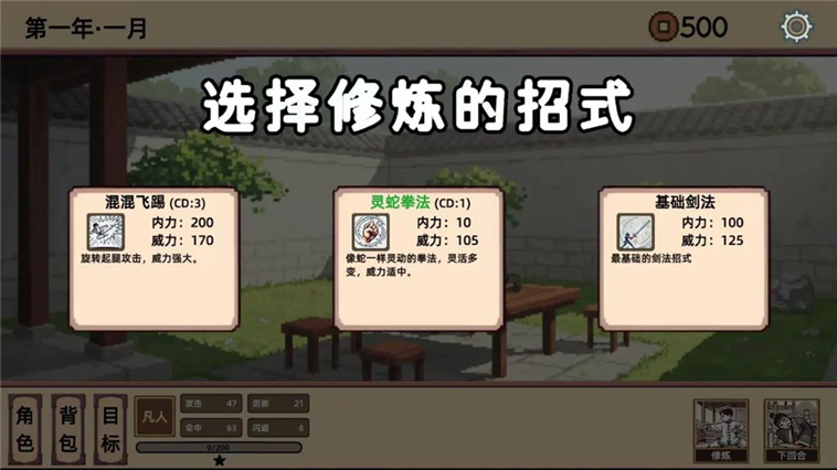 随后选择本次冒险要修炼的招式,每种武学都有独特机制与定位,合理搭配是制胜关键。