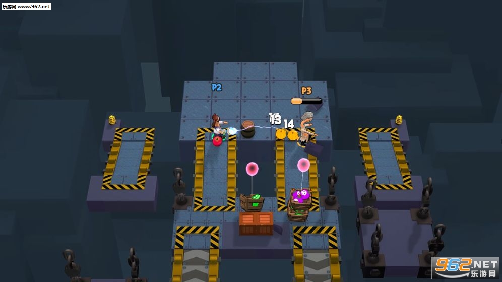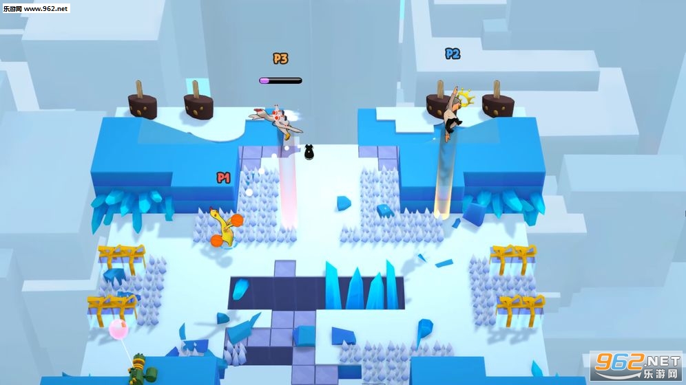 用一大堆稀奇古怪的道具疯狂摧残你的好朋友吧:加特林、汽油罐、飞驰的汽车、香蕉皮、飞机轰炸、弹簧陷阱、冰冻枪。。。数不胜数!