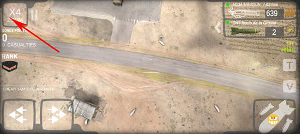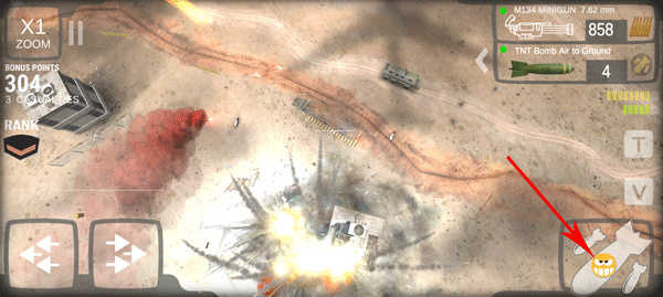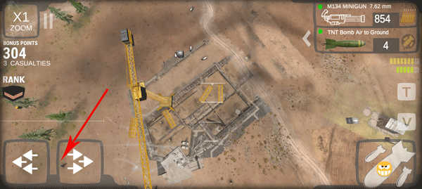 2、熟悉虚拟按键操作逻辑,左下角按键控制飞行方向,屏幕任意位置可触发机枪扫射,右下角为核弹投放键。