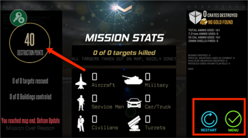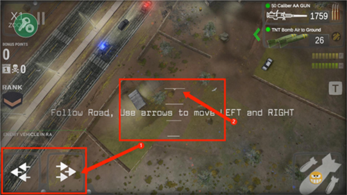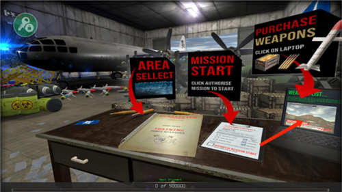 当目标进入准星范围,点击右下角【核弹】图标即可投弹。左上角显示当前得分,右上角显示核弹类型及剩余数量,点击可切换不同弹种。清除所有地面目标即完成任务。