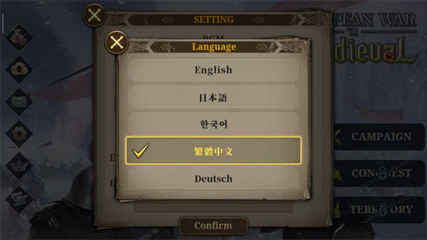 进入游戏后,点击左上角齿轮图标打开设置菜单;在弹出界面中选择Language”选项,将语言切换为繁体中文”;返回主界面即可看到游戏已成功切换为中文显示,畅享无障碍策略体验。