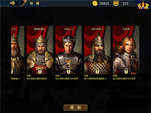 游戏内设有7位氪金神将,每位均附带专属特权,价格区间为18至50元,全套购入约需206元,可大幅提升前期发育效率。抽卡系统分为兵种池与装备池,350勋章可进行10连抽,每次获得10个碎片。兵种需集齐30碎片解锁,后续升级同样依赖碎片积累。装备则需10碎片解锁,每合成3次同级装备可升阶为更高一级。此外,98元的高级通行证不仅赠送大量养成材料,还包含凯撒与贝奥武夫两位金色品质将领。值得注意的是,在征服模式中,有4个国家需额外支付25元解锁(图中已标出),建议根据战略需求酌情考虑。