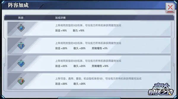 游戏中机体分为6大类型(机动、可变、通用、重型、特殊形态、改造追加)与5种特性(格斗、浮游炮、火力、突击、辅助),形成复杂的克制关系与阵容加成机制。例如:机动克制可变、可变克制通用,攻击被克类型可获得30%伤害加成;上阵3台及以上同类型机体,还能激活攻击与耐久增益,4台以上更享额外克制增伤。
