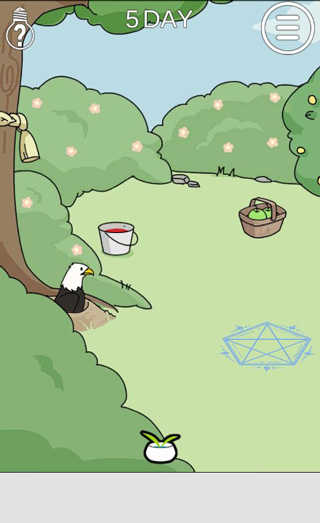 第五关:点击框里的两个苹果,将一个苹果拖到红色油漆桶染色,将红色的苹果放进魔法阵,注意上方会出现一只鸟叼着水桶,用剩下的苹果拖过去砸死他,等鹰进入魔法阵,