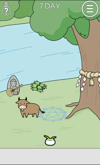 第七关:点击绿色的草饲料,全都点了,3捆给牛吃,牛会,排除不明物体,于是树上的…鳄鱼?就会跳下来。注意:一定要再用一捆草将不明物体盖住再点击符咒 大概是表达…对牛弹琴