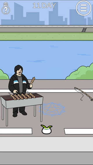 第十一关:点击那个盆栽得到手机打电话会来一辆吊车,烤面筋放在吊车上吊起一条猫