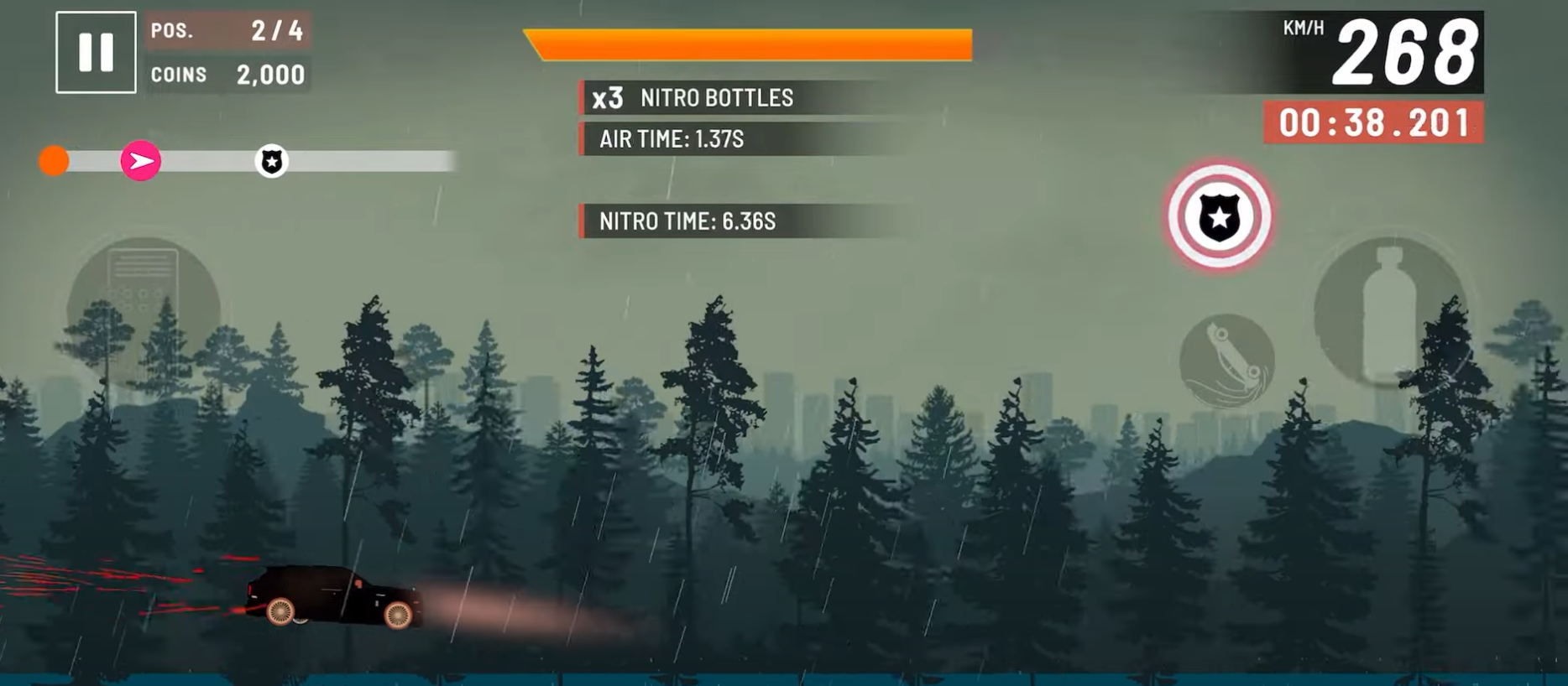 操作界面简洁明了:左侧区域控制前进与刹车,右侧为加速道具触发区,右上角实时显示当前行驶公里数。