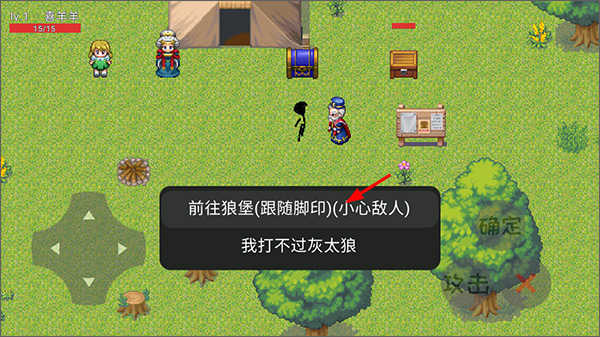 进入游戏后,可直接读取上次存档继续冒险。首先前往村长处了解剧情背景,决定是否迎战灰太狼。随后循着脚印向狼堡进发,途中需警惕雪怪与老虎的突袭——一旦被击败,游戏将强制结束,因此务必主动出击、谨慎前行。特别注意:切勿跟随黑衣人行动,否则极易迷失方向,错失通往狼堡的关键路径。