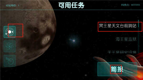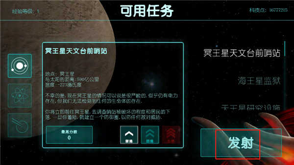 点击可用任务”即可查看当前可挑战的关卡,例如冥王星天文台前哨站”。每个任务均提供三种难度选项,详情页包含地图概览与目标说明。准备就绪后,点击发射”按钮正式开启战斗。