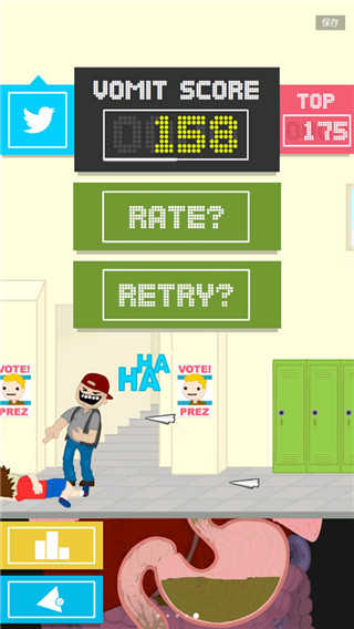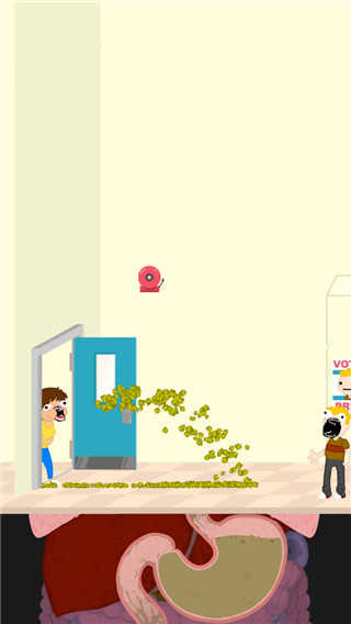 在《呕吐大战》中,战斗并非无脑输出。你的呕吐物”是有限资源,会随着攻击不断消耗,必须合理规划使用节奏。敌人种类丰富,有的投掷纸飞机远程骚扰,有的挥拳近身突袭,甚至还有打篮球的干扰者,每种敌人都需要你灵活调整喷射角度与时机。通过上下滑动屏幕改变呕吐方向,快速点击提升发射频率,既要打得准,也要省着用,真正考验你的操作与判断力。
