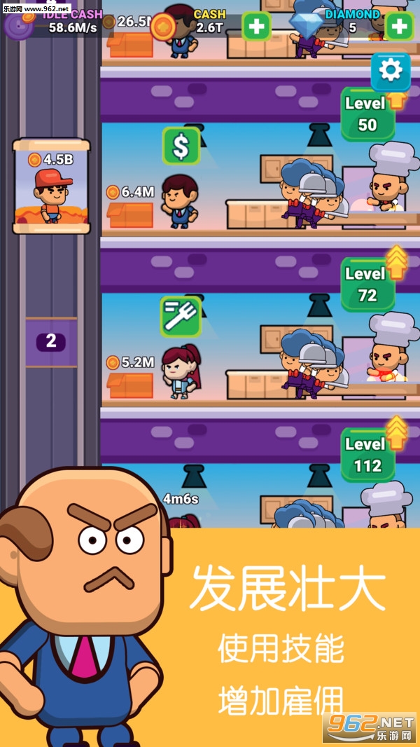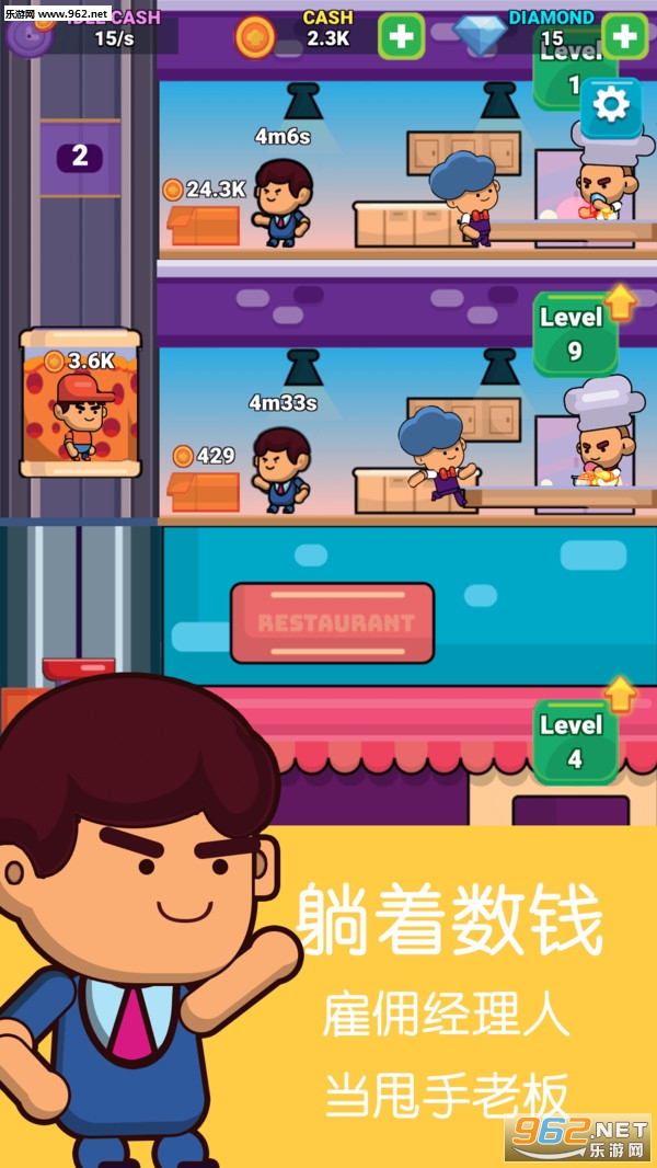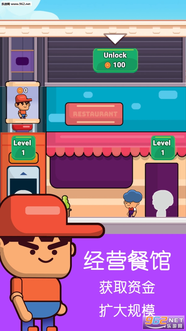 一款风靡全球的经营类游戏。游戏画面精美,音乐动听,操作简单,男女老少皆适宜,尤其适合梦想着开一家餐厅的玩家。在这里,你是整个餐厅的经营者,需要雇佣厨师、服务员、收银员及电梯搬运工,你的任务是不断挣钱,扩大你的餐厅,升级餐厅等级,成为最成功的餐厅老板。