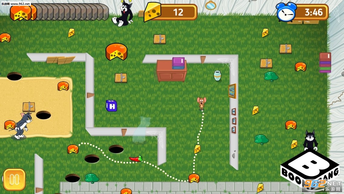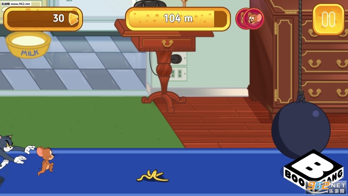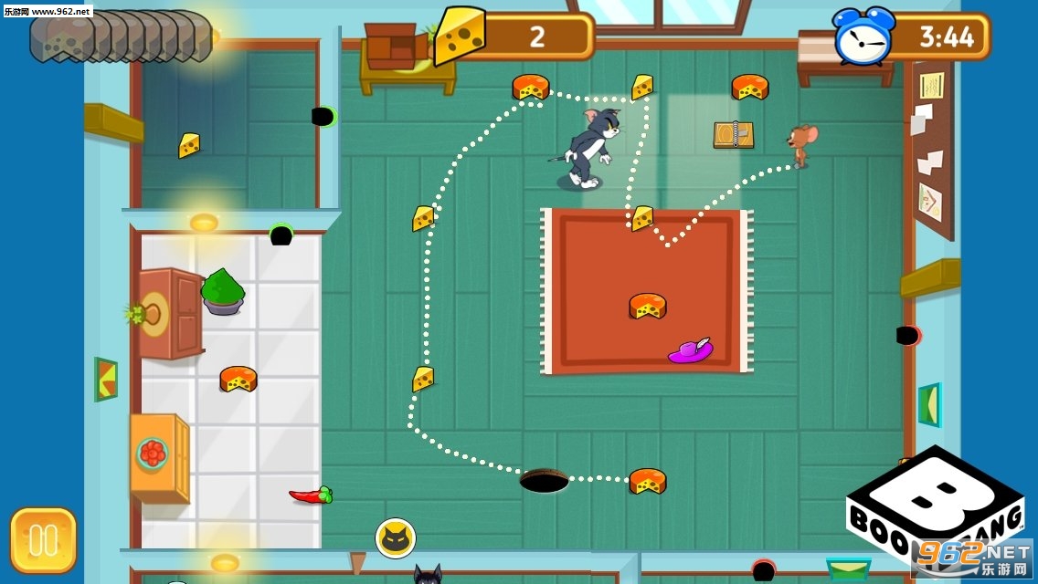 杰瑞的任务是获得所有的奶酪,但它必须小心,因为汤姆正在徘徊,游戏中玩家是以小老鼠的身份进入游戏的,玩家需要避开汤姆的陷阱,并且能成功的吃到奶酪,游戏保留了动画的经典场景,而且画风设计也很精致。