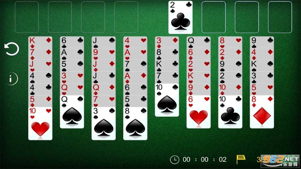 你的终极目标是在右上角的四个回收单元中,分别构建出从A到K、按顺序排列且花色统一的完整牌组(共四组,每组13张)。游戏使用标准52张扑克牌,正面朝上排成八列,所有牌局信息一目了然,考验你的逻辑规划与空间调度能力。