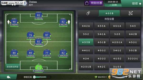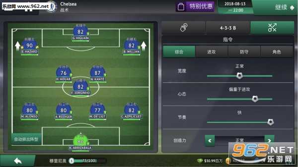 咱们还用小编最爱的切尔西来举例,切尔西的初始阵容后卫线人强马壮,左后卫、右后卫、中后卫都有强人坐镇,所以使用最保险的四后卫阵型就很好;关于中前场,中前卫人才最多,前腰和边锋位置上有阿扎尔、威廉和佩德罗,也足够用,只是中锋位置比较薄弱,只有伊瓜因实力较强,所以我认为4321阵型是最适合的,这个阵型,可以把切尔西队里实力最强的球队都放到首发里。