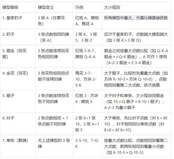 以经典炸金花规则为核心,适配移动端操作习惯,支持 2-4 人对局(玩家 + 系统 AI,无真实玩家实时对战,避免社交干扰)。游戏使用一副去掉大小王的 52 张扑克牌,玩家通过组合手中 3 张牌形成不同牌型,在 看牌”跟注”加注”弃牌” 等操作中决策,最终通过牌型大小比拼赢得虚拟筹码 欢乐豆”,核心目标是 合理判断牌力,最大化欢乐豆收益”。