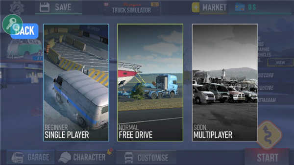 3、这里有各种各样的卡车,你可以选择一种,5种不同的卡车类型,你可以自定义和升级,完成各种运输任务,获得奖励。