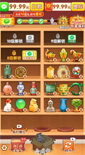 古物寻踪赚钱小游戏是由北京云创星科技有限公司推出的一款休闲益智类游戏。在游戏中玩家将成为一名古物鉴定师,面对杂乱摆放的古物,玩家需要仔细观察,将同样的古物摆放在一个柜子里,三个相同的古物即可达成消除效果,玩家也可获得相应分数。达到一定的分数,玩家即可获得红包奖励,红包积累起来即可提现赚钱。感兴趣的朋友们快来下载试试吧!