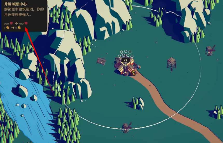 5、第五关:继续强化中心城堡,选择建筑成本更低的选项。建造3级火焰尖塔清理杂兵,设置双层城墙封锁入口,并在右下高台部署火箭兵专克投石车。