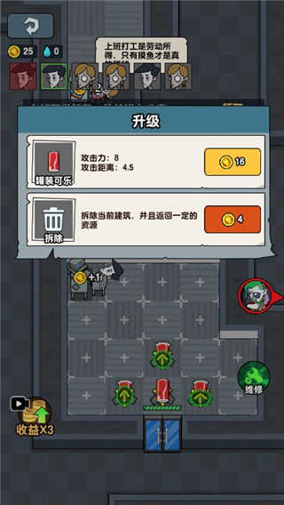 特别注意:当门血量告急时,务必第一时间使用金币进行升级,此举不仅能瞬间恢复部分耐久,还能提升整体抗压能力,为后续摸鱼争取宝贵时间。