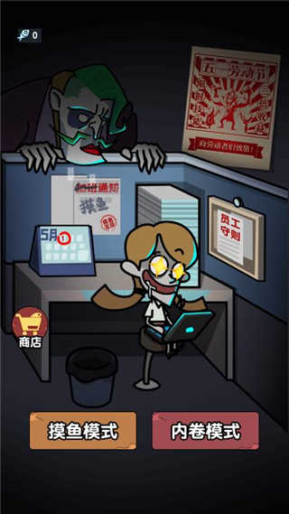 游戏提供两种截然不同的模式:摸鱼模式”主打防守与收益积累,而内卷模式”则强调对抗与效率竞争。玩家可自由选择,体验不同风格的职场生存挑战。进入游戏后,你将被分配到一间空闲办公室,在30秒内迅速布置防御道具,构建属于自己的摸鱼堡垒”。