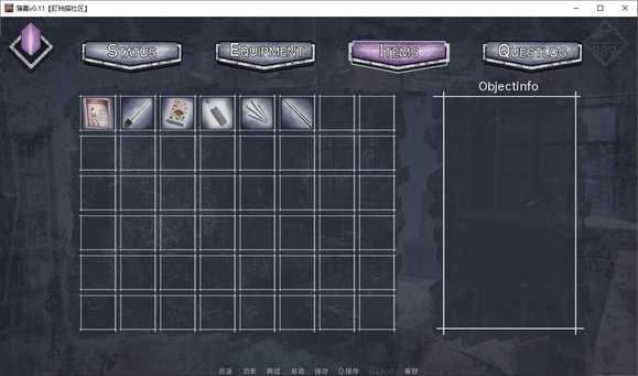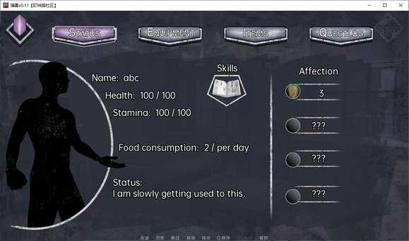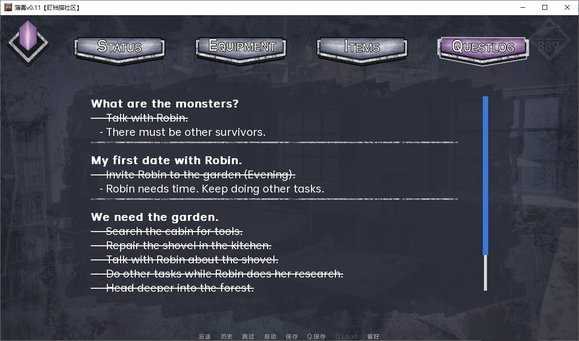 STATUS(状态):查看生命值、耐力、诅咒及与各角色的好感度;EQUIPMENT(装备):切换近战(小刀、长矛、斧头)与远程武器(气枪、双管猎枪、手枪);ITEMS(物品):管理收集到的资源与关键道具;QUESTLOG(任务日志):追踪主线与支线任务进度。