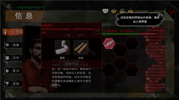 游戏界面直观实用:点击角色头像可查看当前健康状态,包括是否感染疾病;背包系统用于管理食物、药品及其他关键物资。合理分配资源、监控身体状况,是在末日中活下去的基础。随着探索深入,你将逐步解锁更多技能与剧情线索,一步步逼近人类X计划”的核心真相。